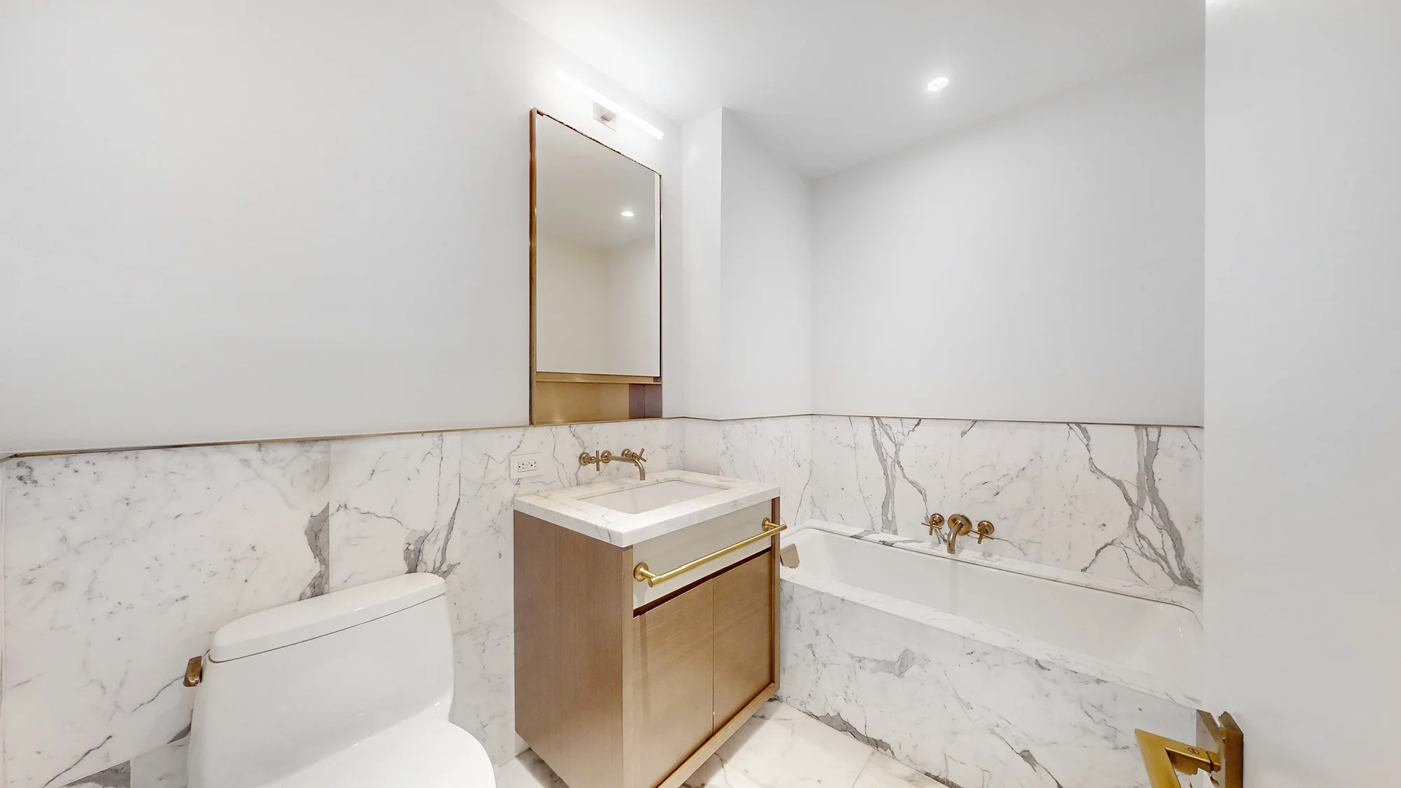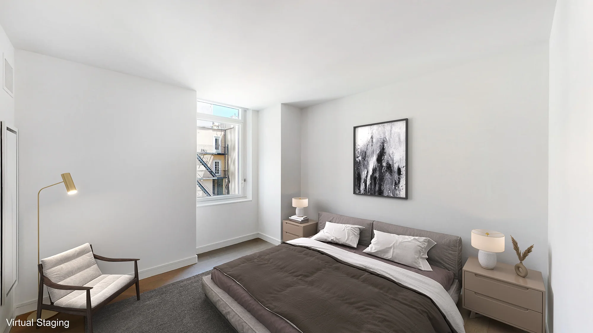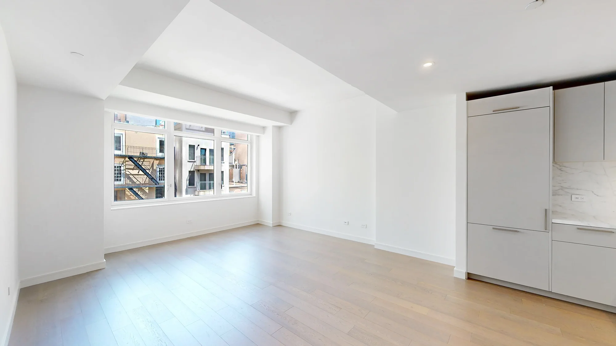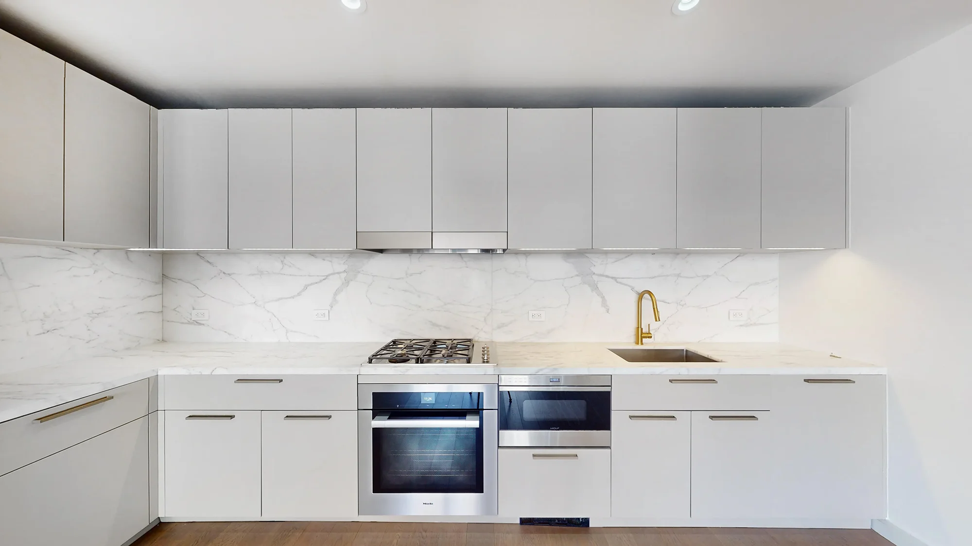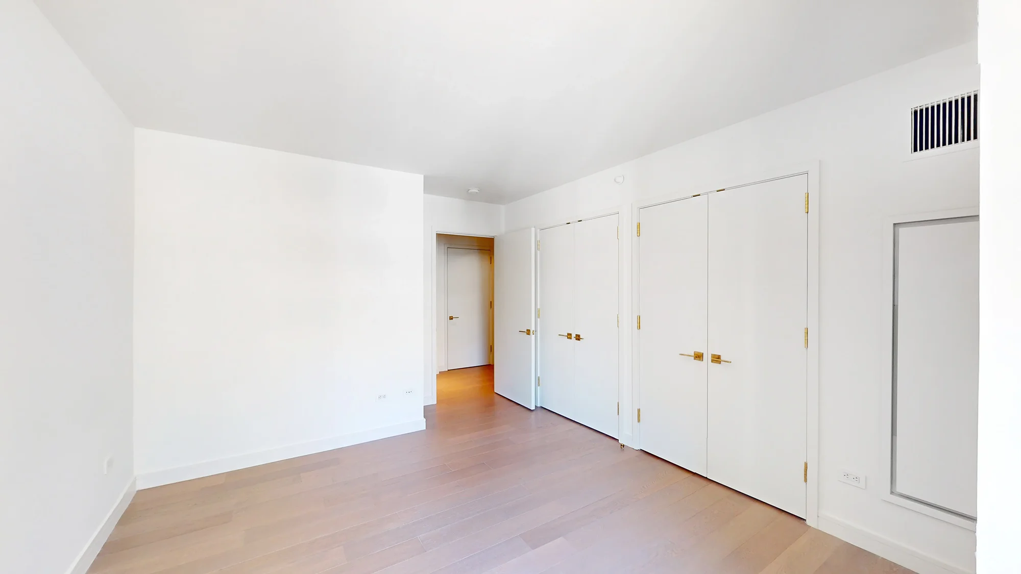 5A is a spectacular residence. An expansive 858 square foot one-bedroom with a gracious entry foyer, and loft-style living area that is perfect for entertaining. This apartment features a custom-designed POLIFORM kitchen with a breakfast bar countertop, Calacatta Gold marble, and Miele appliances. The bathroom features white statuary marble with bronze fittings, a deep soaking bathtub, and radiant heated floors. Approximately ten-foot tall ceilings, wall-to-wall double pane South facing windows, washer/dryer, and smoked oak flooring throughout.