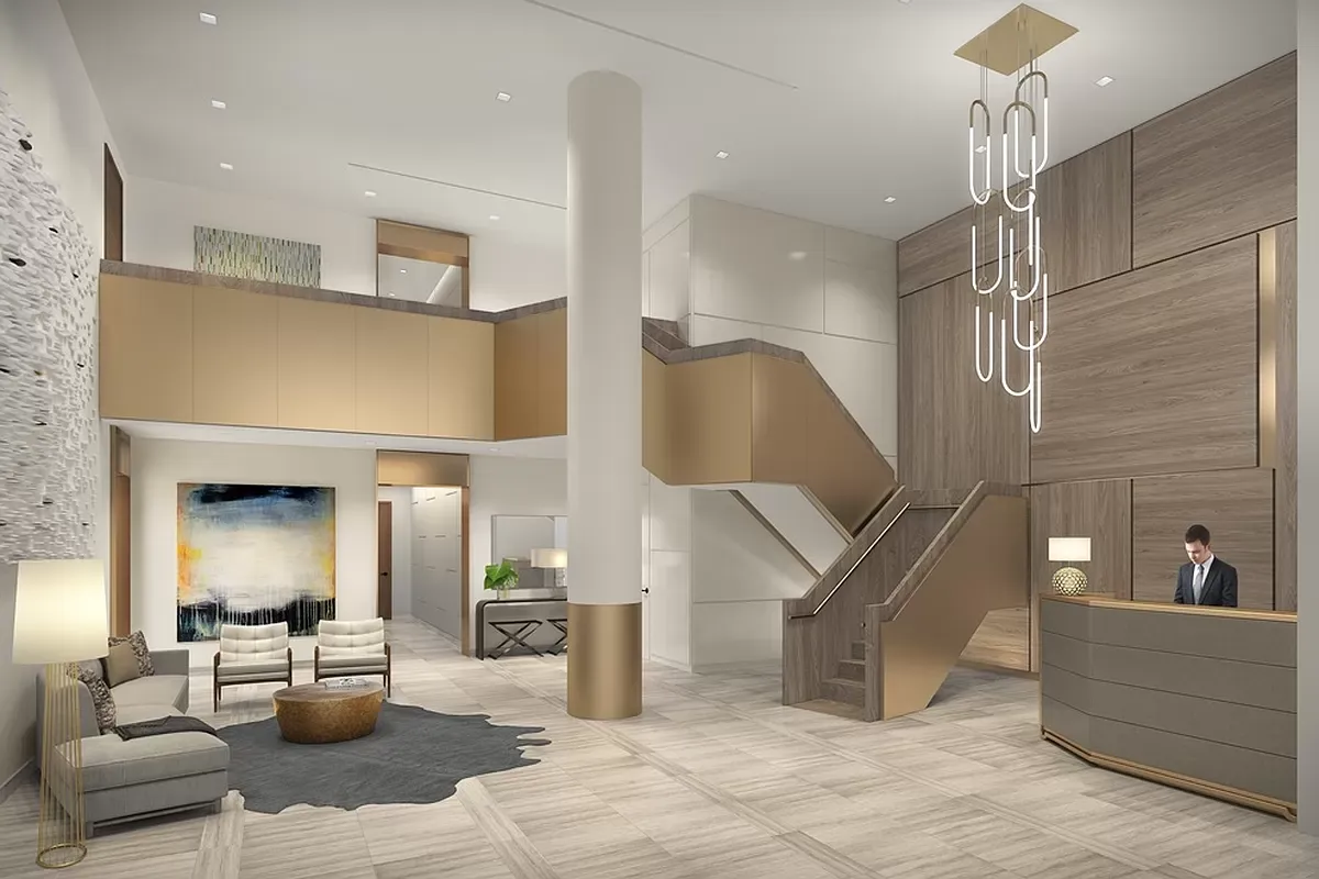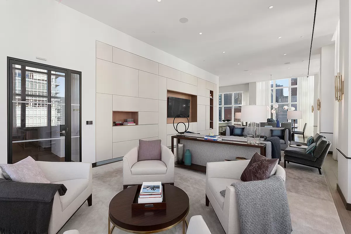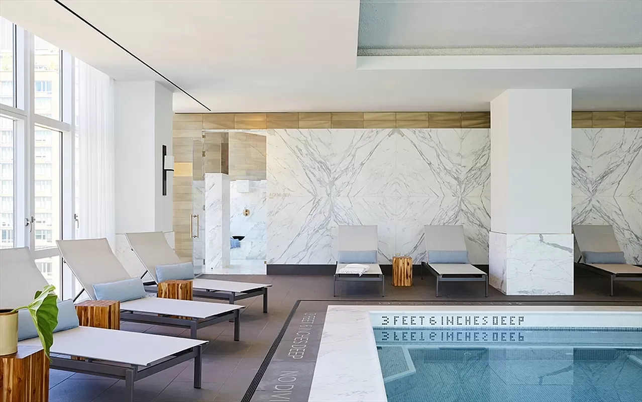 Residents have a Bevy of luxuries at their fingertips. A beautiful entrance, the building lobby, 24/7 doorman, 2nd floor has a library, courtyard, and kids playroom. The 21st floor has double-height floor-to-ceiling windows used as a multi-purpose space for yoga, spin classes, Pilates, stretching, and Fitness Center. There is a 52-foot heated pool, indoor sundeck, sauna, spa, juice bar, massage rooms, and a loft-like lounge that can accommodate dining for 10 or a cocktail party for 50.