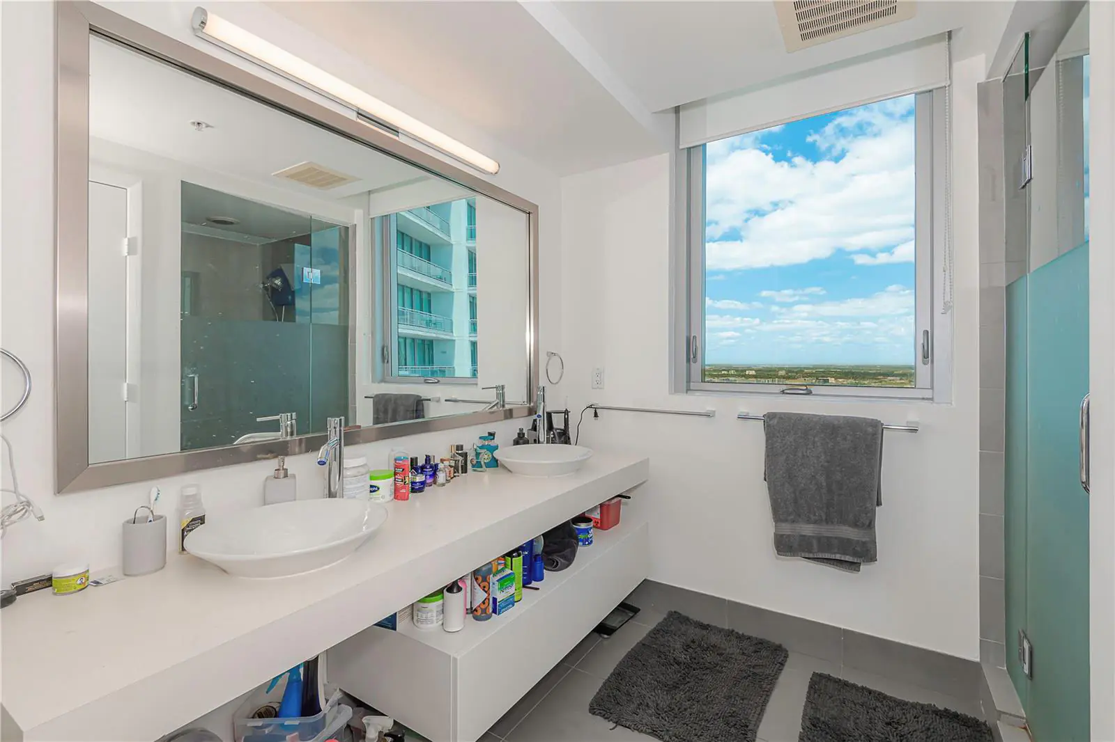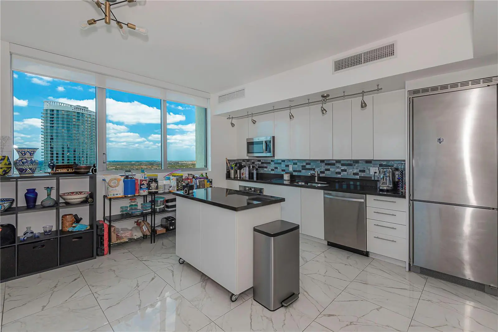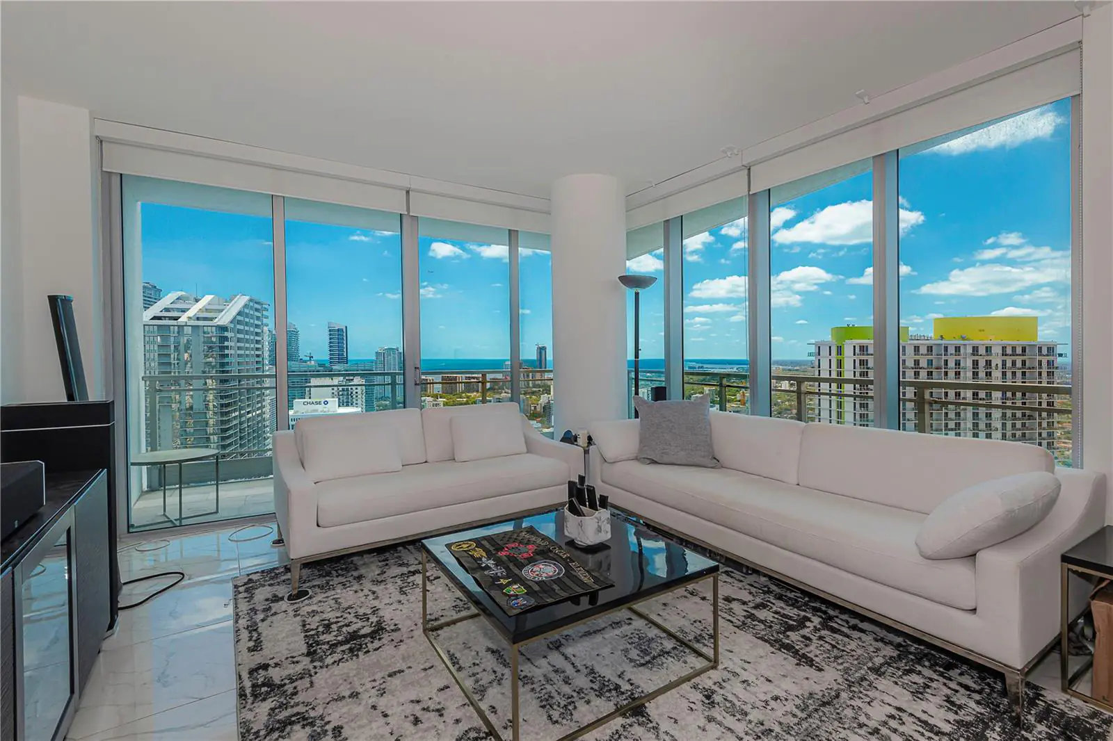 Stunning 2-Bedroom Sky Home on the 46th Floor! Welcome to luxury living at its finest! Nestled high on the 46th floor, this immaculate 2-bedroom plus den, 2.5-bath residence boasts the best floor plan in the building, featuring a spacious, open split layout that perfectly balances privacy and flow. Gleaming white marble floors create a sense of elegance throughout.